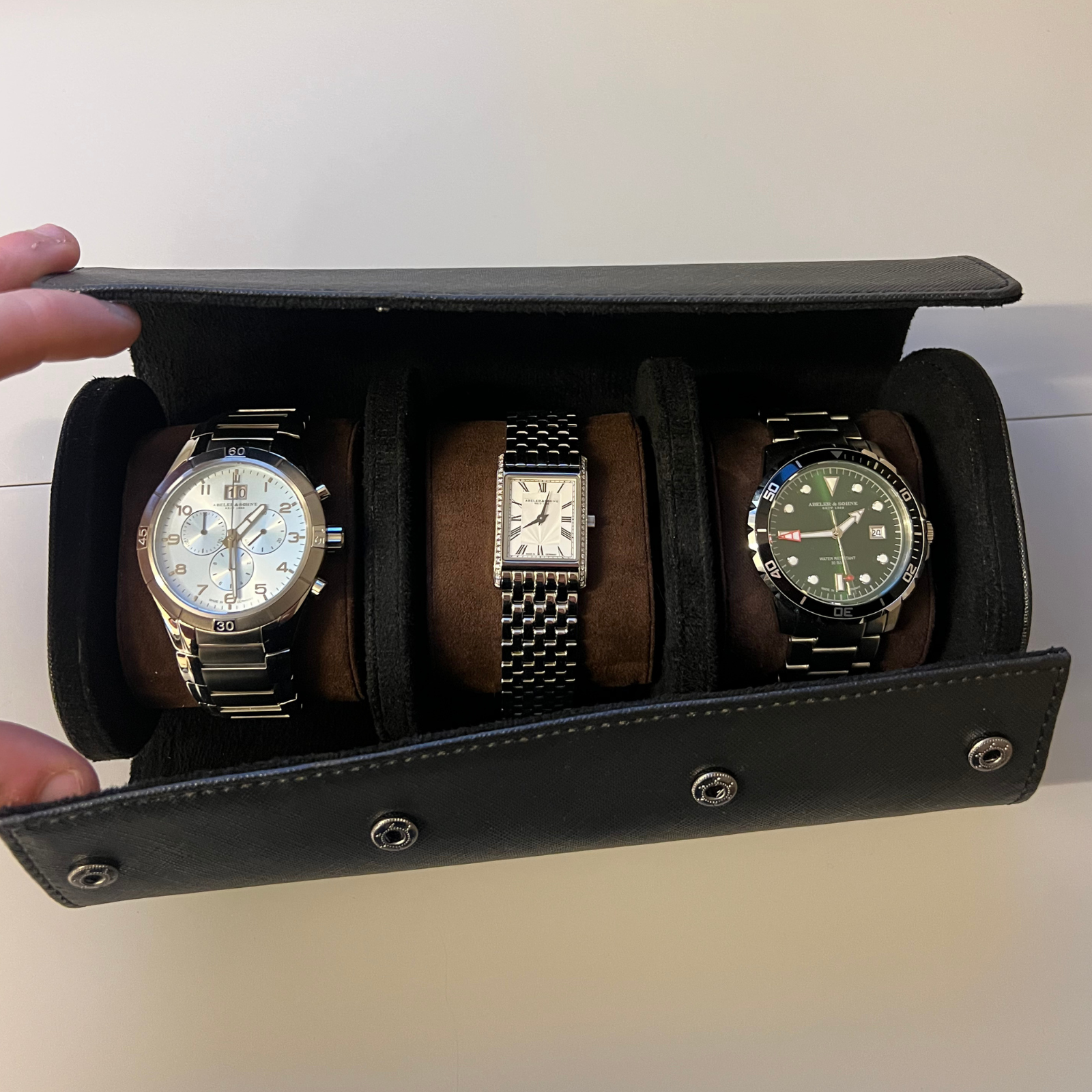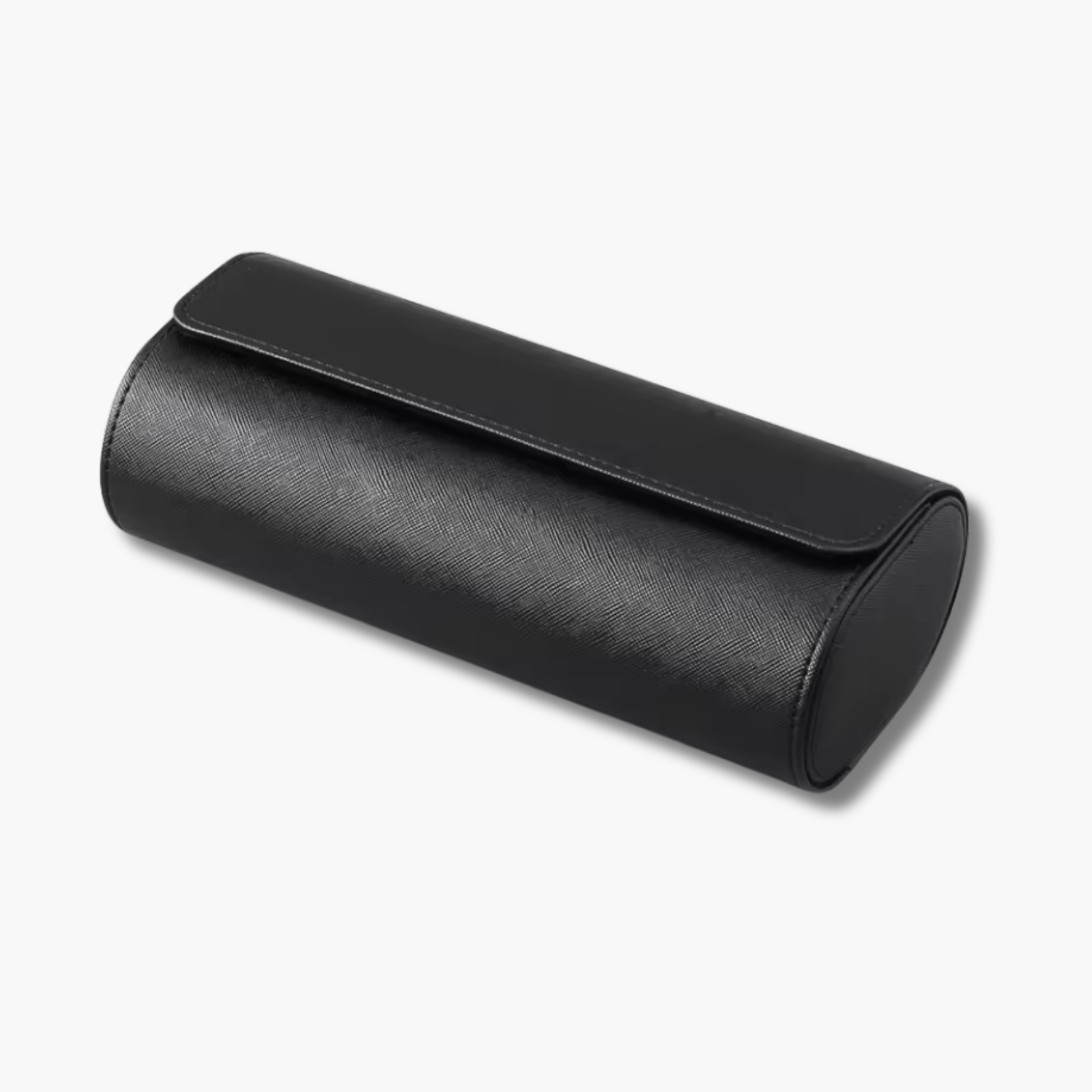 Denne klokkerullen i svart skinn er utviklet for sikker og elegant oppbevaring av opptil tre klokker. Den beskytter urene mot riper og støt, og er ideell både til reise og oppbevaring hjemme. Et praktisk og stilrent tilbehør for klokkeentusiasten som ønsker orden og trygg transport.